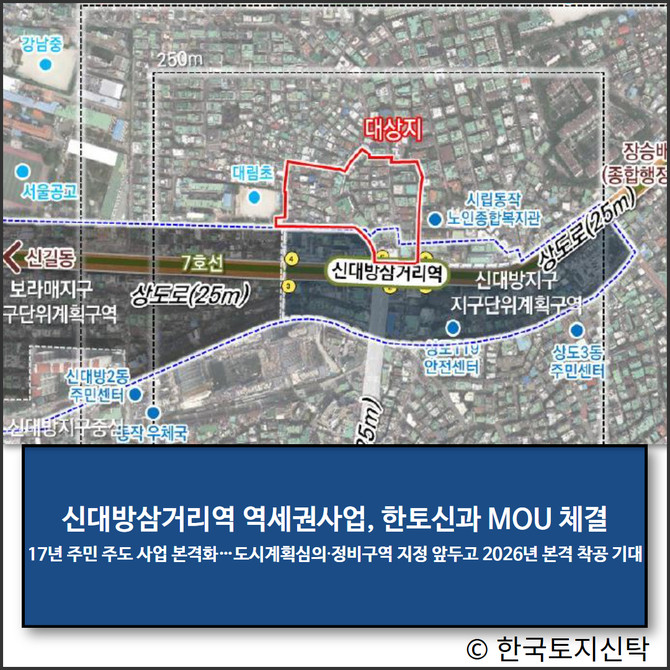 '신대방삼거리역 역세권활성화 사업'이 한국토지신탁(이하 한토신)과 신탁방식 사업추진을 위한 업무협약을 체결하면서 속도를 낼 전망이다.