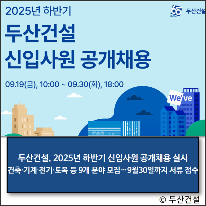 두산건설은 "올해 창립 65주년을 맞아 미래 성장 동력을 함께 만들어갈 인재를 영입하고자 한다"며 "채용 과정에서 매년 관심과 호응이 확대되고 있는 만큼, 도전정신과 열정을 가진 지원자들의 많은 관심과 지원을 기대한다"고 말했다.