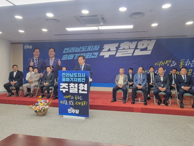 주 의원은 이날 기자회견에서 '이재명과 함께 할 진짜 일꾼 주철현, 도민과 함께 전남 미래 100년 여는 선봉장'을 비전으로 제시하며, 6대 핵심 비전을 밝혔다.