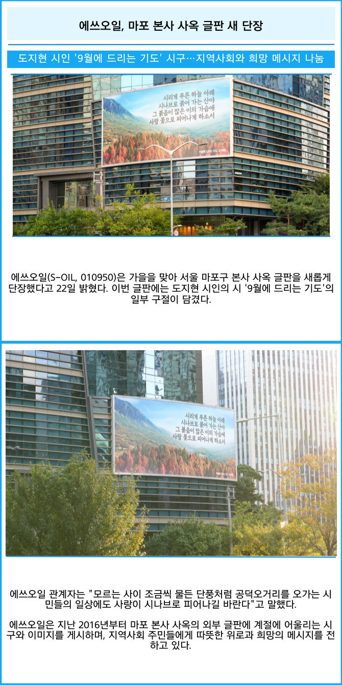[프라임경제] 에쓰오일(S-OIL, 010950)은 가을을 맞아 서울 마포구 본사 사옥 글판을 새롭게 단장했다고 22일 밝혔다. 이번 글판에는 도지현 시인의 시 '9월에 드리는 기도'의 일부 구절이 담겼다.