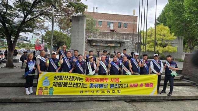경산시 환경관리원 노동조합(위원장 남상복)은 지난 18일 노조 창립 20주년을 맞이해 영남대 정문 및 압량읍 농협사거리 일원에서 환경관리원 23명이 참여한 가운데 '올바른 생활쓰레기 배출 캠페인'을 전개했다.