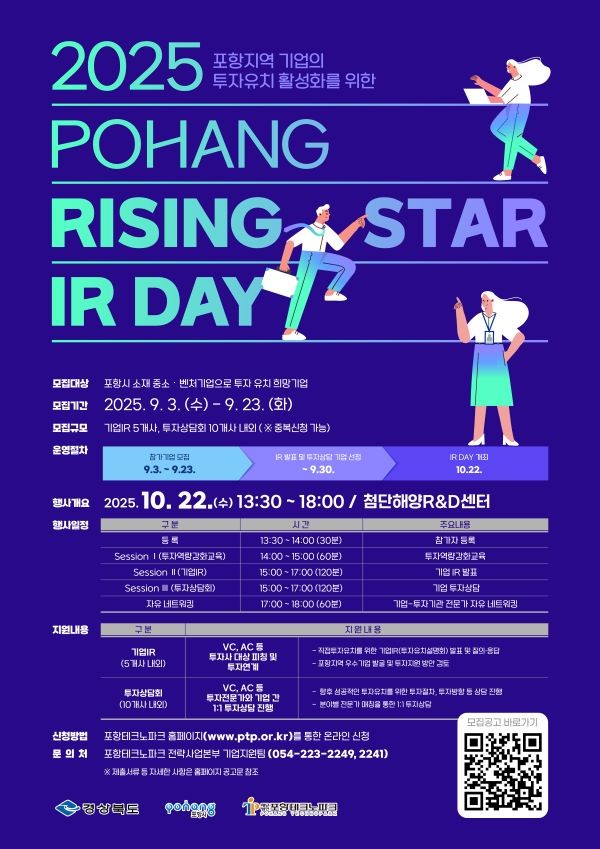 [프라임경제] 포항테크노파크(원장 배영호)는 포항지역 중소·벤처기업의 투자유치 활성화를 위해 개최하는 '2025년 포항 Rising Star IR DAY' 참가기업을 모집한다.
