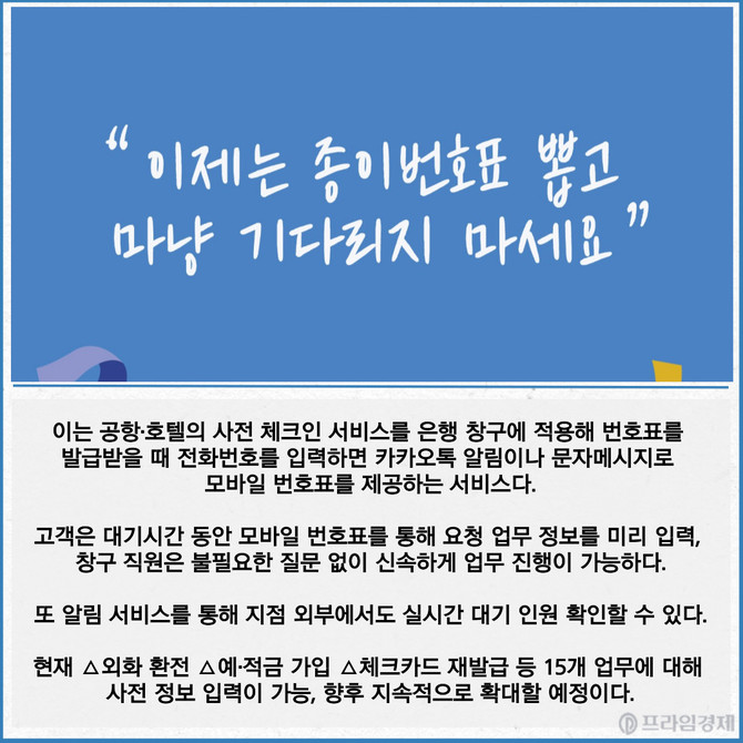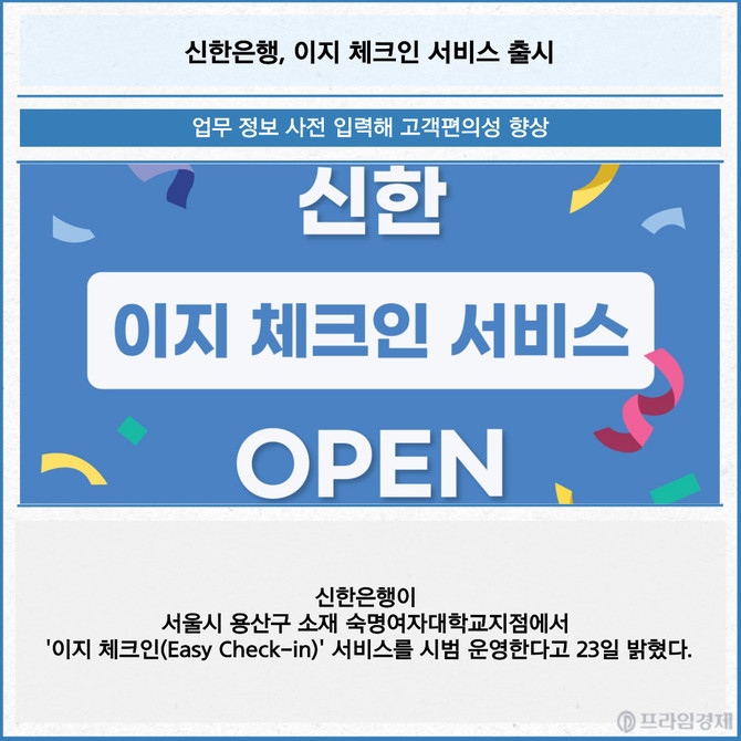 [프라임경제] 신한은행이 서울시 용산구 소재 숙명여자대학교지점에서 '이지 체크인(Easy Check-in)' 서비스를 시범 운영한다고 23일 밝혔다.