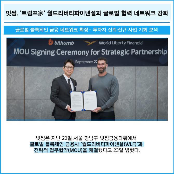 [프라임경제] 빗썸은 지난 22일 서울 강남구 빗썸금융타워에서 글로벌 블록체인 금융사 '월드리버티파이낸셜(WLF)'과 전략적 업무협약(MOU)을 체결했다고 23일 밝혔다.