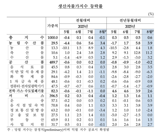 공산품은 보합세를 보였다. 석탄·석유제품(-1.1%) 등이 내렸음에도 음료품(0.3%) 등이 상승한 영향이다. 전력·가스·수도 및 폐기물은 지난달과 같은 수치를 나타냈다.