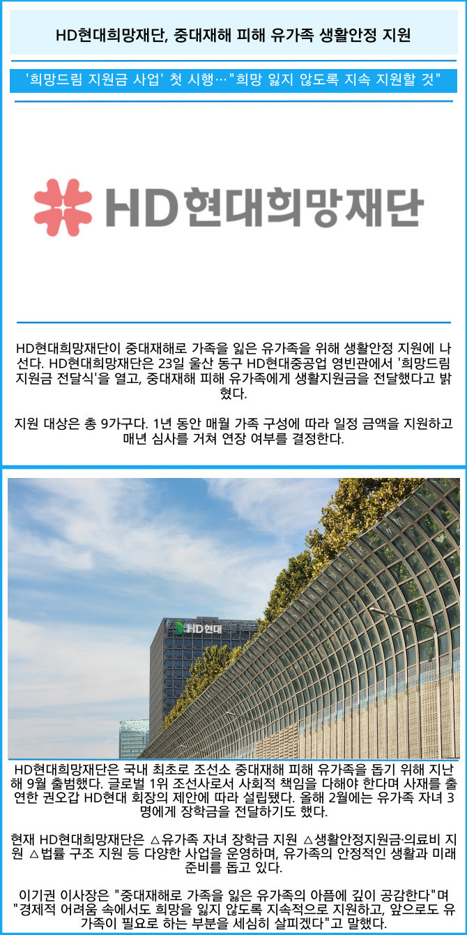 [프라임경제] HD현대희망재단이 중대재해로 가족을 잃은 유가족을 위해 생활안정 지원에 나선다. HD현대희망재단은 23일 울산 동구 HD현대중공업 영빈관에서 '희망드림 지원금 전달식'을 열고, 중대재해 피해 유가족에게 생활지원금을 전달했다고 밝혔다.