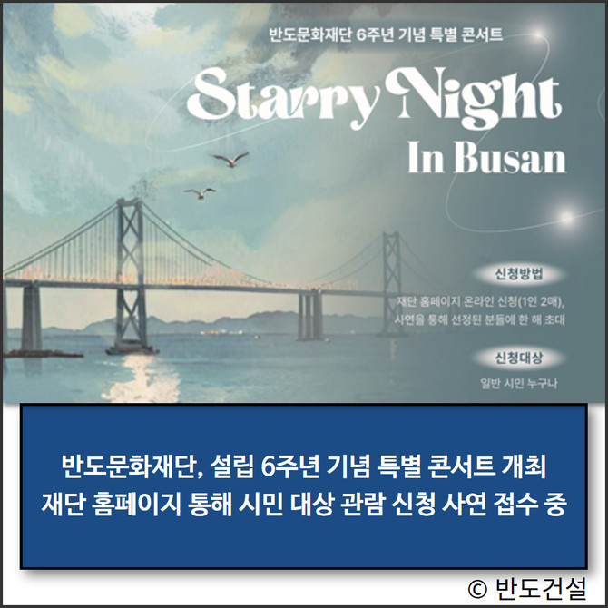 반도건설이 설립한 비영리 공익법인 반도문화재단이 설립 6주년을 맞아 다가오는 10월25일 오후 6시 부산 KBS홀에서 소외계층을 포함한 시민 및 후원사 가족과 함께하는 특별 콘서트'Starry Night In Busan'를 개최한다.
