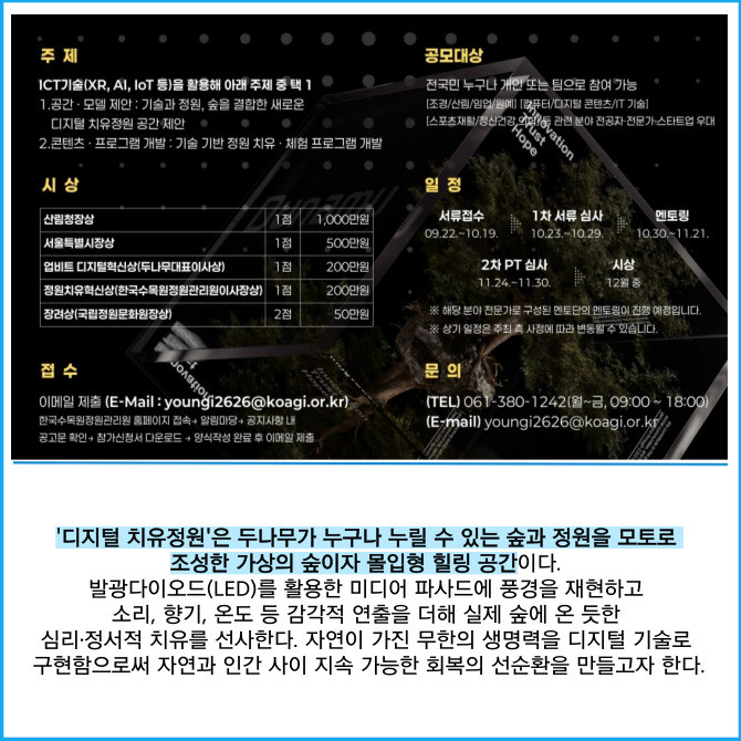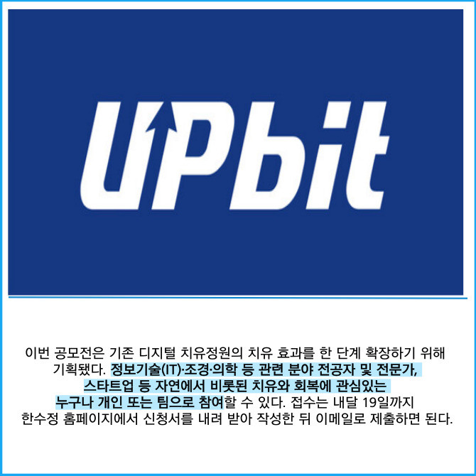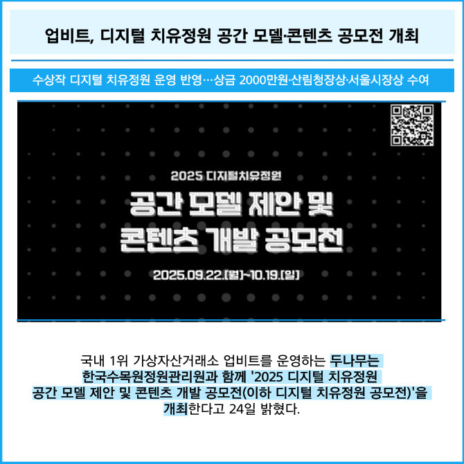 [프라임경제] 국내 1위 가상자산거래소 업비트를 운영하는 두나무는 한국수목원정원관리원과 함께 '2025 디지털 치유정원 공간 모델 제안 및 콘텐츠 개발 공모전(이하 디지털 치유정원 공모전)'을 개최한다고 24일 밝혔다.