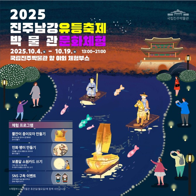 [프라임경제] 국립진주박물관이 2025 진주남강유등축제 기간(10월4일부터 19일) 동안 오후 1시부터 9시까지 박물관 앞마당에서 다양한 체험프로그램을 운영한다.