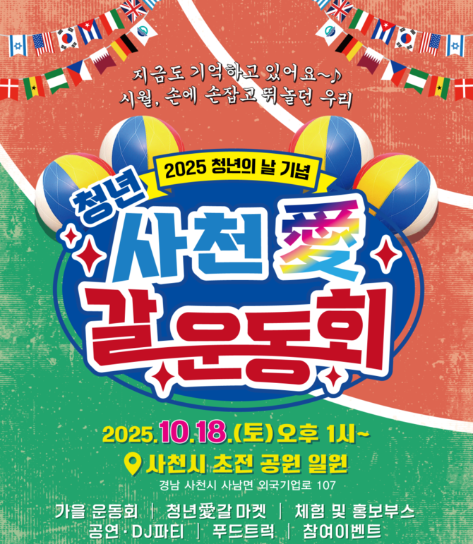 시는 10월18일 오후 1시부터 초전공원 일원에서 '청년 사천愛(애) 갈 운동회'를 열고 지역 청년들과 시민들이 함께 어울릴 수 있는 기회를 제공한다. 이번 행사는 청년들이 일상에서 벗어나 서로 소통하고 즐길 수 있는 참여형 축제다.