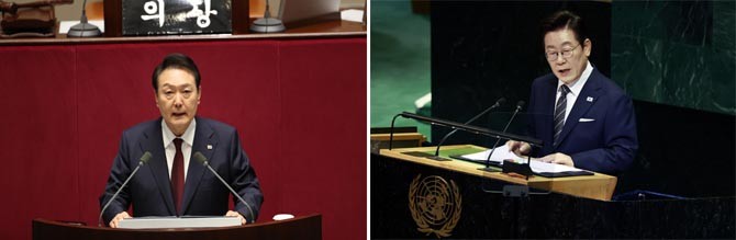 불과 2년 만에 대북 기조가 변화됐다. 북한을 대하는 윤석열 전 대통령과 이재명 대통령의 입장차가 유엔총회 기조연설에서도 극명하게 드러났다는 평가다.