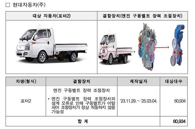 현대차 포터2(6만934대)와 기아 봉고3(3만3990대)는 엔진 구동벨트 장력 조절 장치 설계 오류가 확인됐다. 구동벨트 이탈 시 조향장치가 정상적으로 작동하지 않을 수 있어 안전에 직접적인 영향을 줄 수 있다. 이들 차량은 오는 25일부터 무상수리가 진행된다.