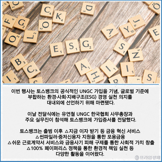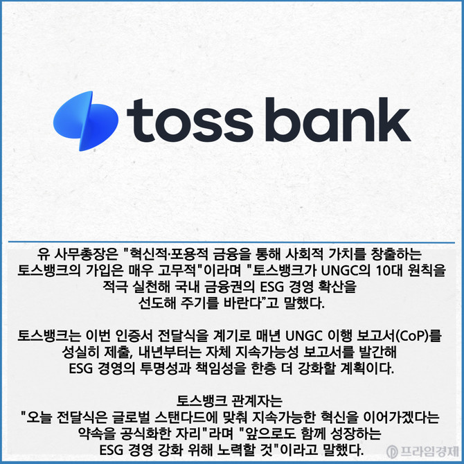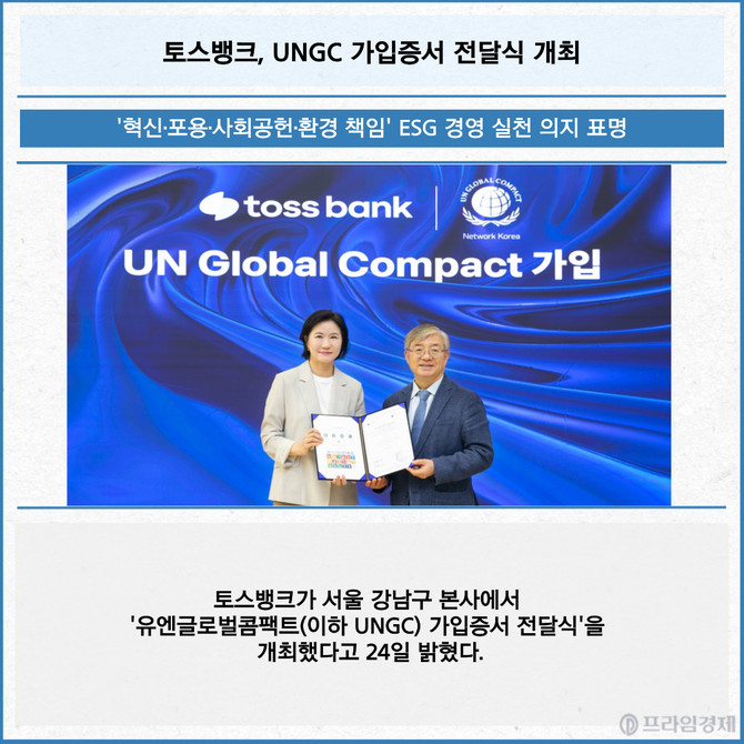 [프라임경제] 토스뱅크가 서울 강남구 본사에서 '유엔글로벌콤팩트(이하 UNGC) 가입증서 전달식'을 개최했다고 24일 밝혔다.