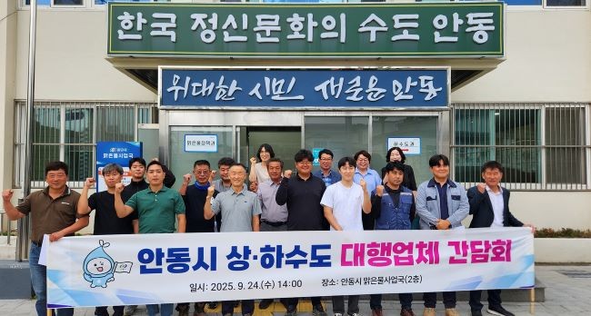안동시는 24일 맑은물사업국 2층 국장실에서 상·하수도 대행업체 10개 사 대표들과 맑은물사업국 직원 등 20여 명이 참석한 가운데, 사업 품질향상 및 상호협력 강화를 위한 '상·하수도대행업체 간담회'를 개최했다.