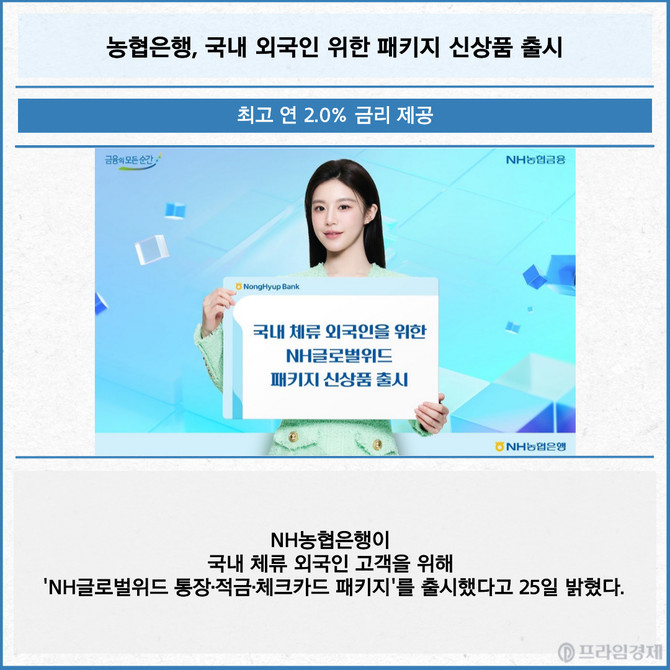 [프라임경제] NH농협은행이 국내 체류 외국인 고객을 위해 'NH글로벌위드 통장·적금·체크카드 패키지'를 출시했다고 25일 밝혔다.
