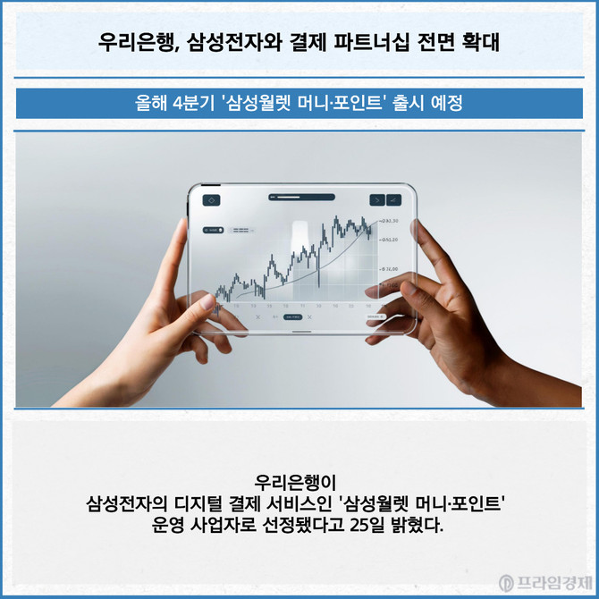 [프라임경제] 우리은행이 삼성전자의 디지털 결제 서비스인 '삼성월렛 머니·포인트' 운영 사업자로 선정됐다고 25일 밝혔다.