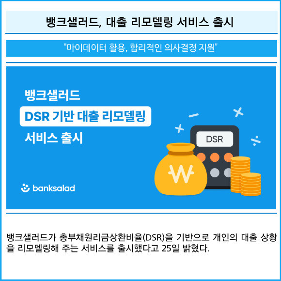 [프라임경제] 뱅크샐러드가 총부채원리금상환비율(DSR)을 기반으로 개인의 대출 상황을 리모델링해 주는 서비스를 출시했다고 25일 밝혔다.