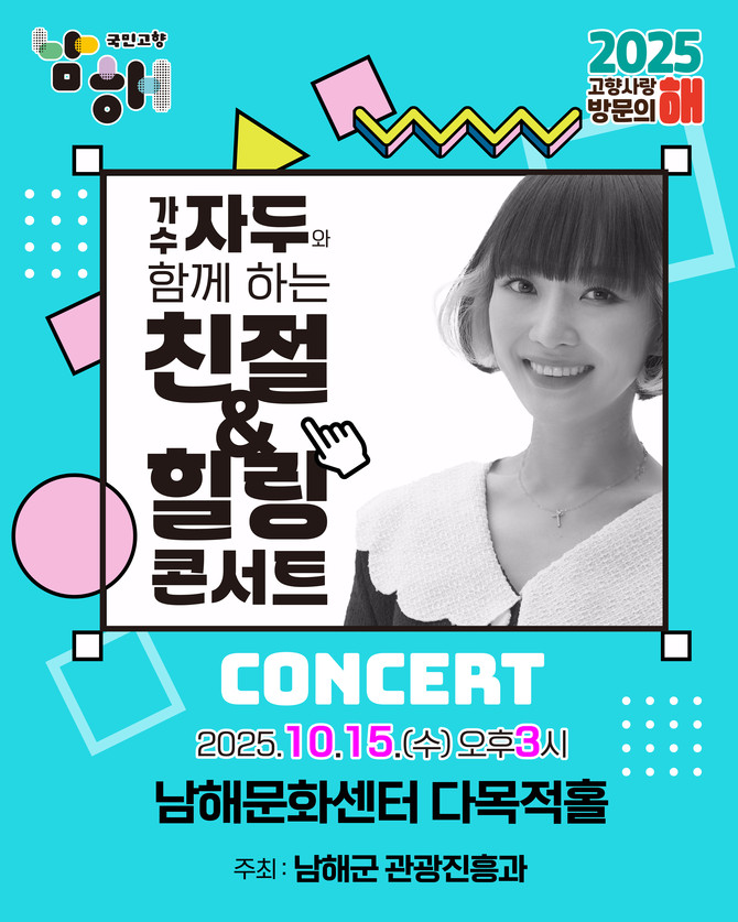[프라임경제] 남해군은 오는 10월15일 오후 3시, 남해문화센터 다목적홀에서 '가수 자두와 함께하는 친절 & 힐링 콘서트'를 개최한다. 이번 콘서트는 '2025 고향사랑 방문의 해'를 맞아 군민과 관광객에게 따뜻한 친절 문화의 중요성을 알리고 음악을 통한 힐링의 시간을 선사하기 위해 마련됐다.