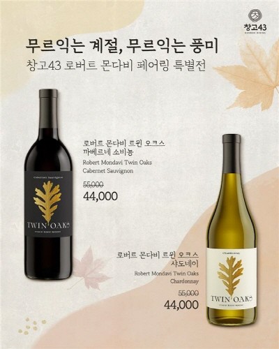 이번 행사에서는 세계적으로 사랑받는 로버트 몬다비 와인 2종을 할인된 가격에 제공한다. '트윈 오크스 까베르네 소비뇽'과 '트윈 오크스 샤도네이'를 20% 할인된 4만4000원에 즐길 수 있으며, 프로모션은 11월30일까지 창고43 전 매장에서 진행된다.