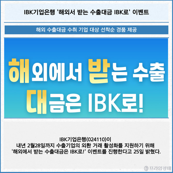 [프라임경제] IBK기업은행(024110)이 내년 2월28일까지 수출기업의 외환 거래 활성화를 지원하기 위해 '해외에서 받는 수출대금은 IBK로!' 이벤트를 진행한다고 25일 밝혔다.