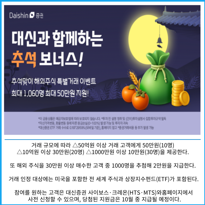 [카드] 대신증권 "추석 연휴 해외주식 거래하고 지원금 받아가세요"