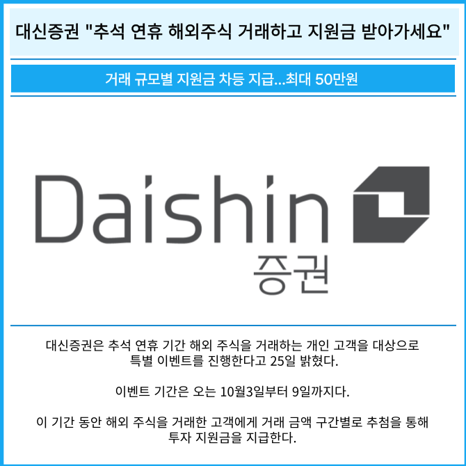 [프라임경제] 대신증권(003540)은 추석 연휴 기간 해외 주식을 거래하는 개인 고객을 대상으로 특별 이벤트를 진행한다고 25일 밝혔다.
