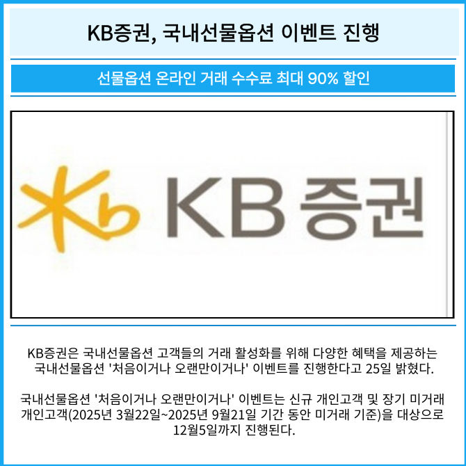 [프라임경제] KB증권은 국내선물옵션 고객들의 거래 활성화를 위해 다양한 혜택을 제공하는 국내선물옵션 '처음이거나 오랜만이거나' 이벤트를 진행한다고 25일 밝혔다.