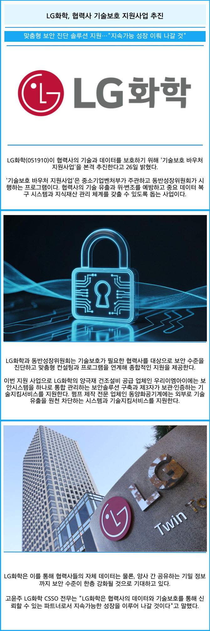 [프라임경제] LG화학(051910)이 협력사의 기술과 데이터를 보호하기 위해 '기술보호 바우처 지원사업'을 본격 추진한다고 26일 밝혔다.