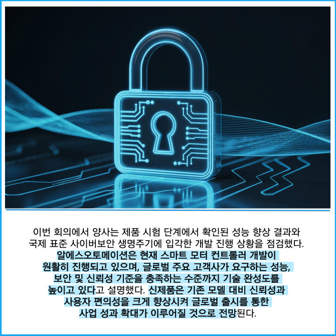 [프라임경제] 모션 제어 및 자동화 솔루션 전문기업 알에스오토메이션(140670)은 최근 글로벌 자동화 선도 기업 '로크웰오토메이션'과 개최한 차세대 스마트 모터 컨트롤러(SMC) 전략회의에서 제품 개발 진척과 향후 협력 강화를 위한 로드맵을 구체화했다고 26일 밝혔다.