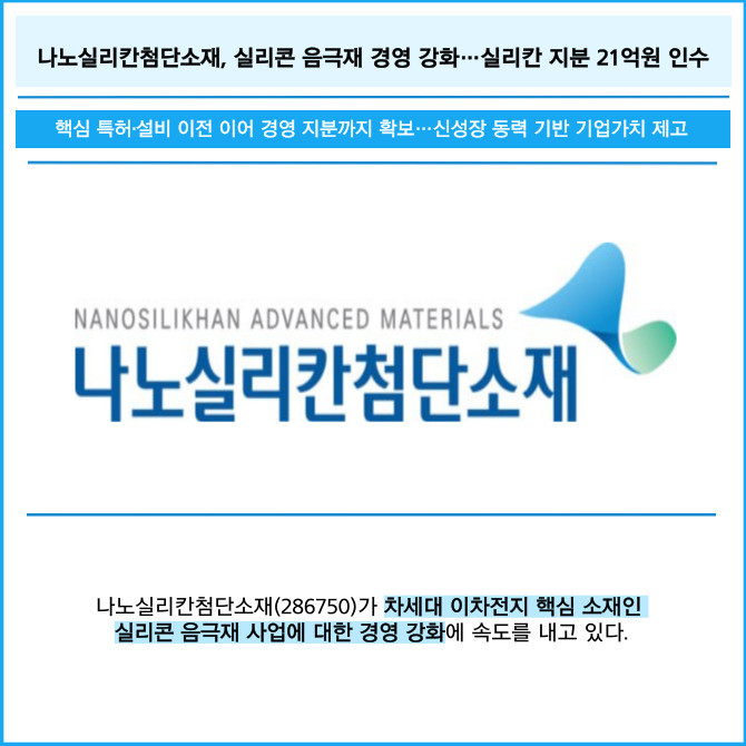 [프라임경제] 나노실리칸첨단소재(286750)는 공시를 통해 실리칸이 자사의 최대주주 드림캐슬종합건설 보유 지분 103만7429주를 21억원(주당 2024원)에 양수했다고 26일 밝혔다.
