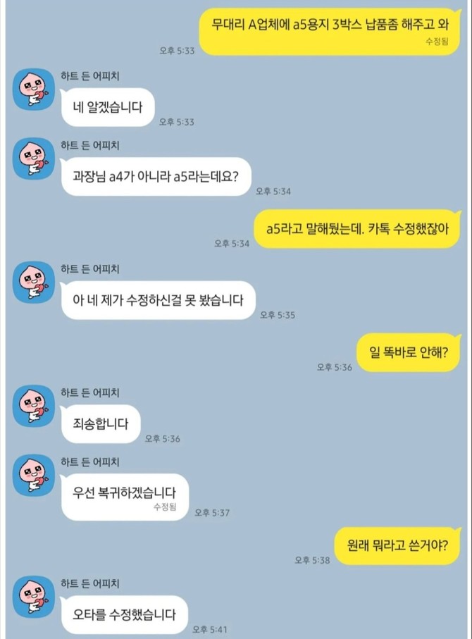 상사는 업체에 A4용지를 납품하라고 카카오톡 메시지를 보냈다가 나중에 'A4'를 'A5'로 수정했는데 부하가 이를 보지 못했다.