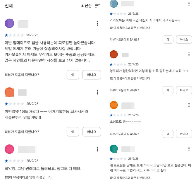 구글 플레이스토어 등 앱스토어에는 "이번 업데이트로 앱을 사용하는데 피로감만 높아졌다", "제발 메신저로써 충실해라", "새로 한다는 업데이트 취소하고 롤백시켜달라", "업데이트 절대 하지마라", "무작위로 보이는 숏폼과 궁금하지도 않은 지인들의 대문짝만한 사진들 보고 싶지 않다" 등 혹평이 나오고 있다.