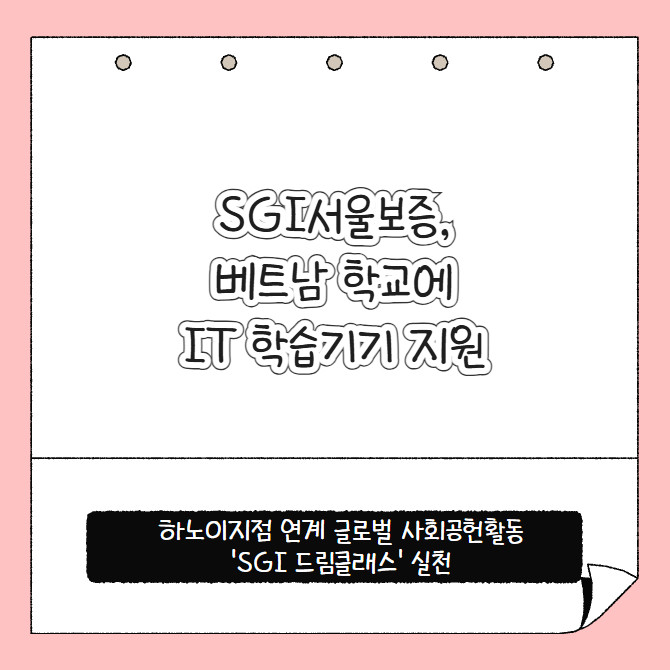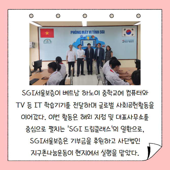 [프라임경제] SGI서울보증이 베트남 하노이 중학교에 컴퓨터와 TV 등 IT 학습기기를 전달하며 글로벌 사회공헌활동을 이어갔다. 이번 활동은 해외 지점 및 대표사무소를 중심으로 펼치는 'SGI 드림클래스'의 일환으로, SGI서울보증은 기부금을 후원하고 사단법인 지구촌나눔운동이 현지에서 실행을 맡았다.