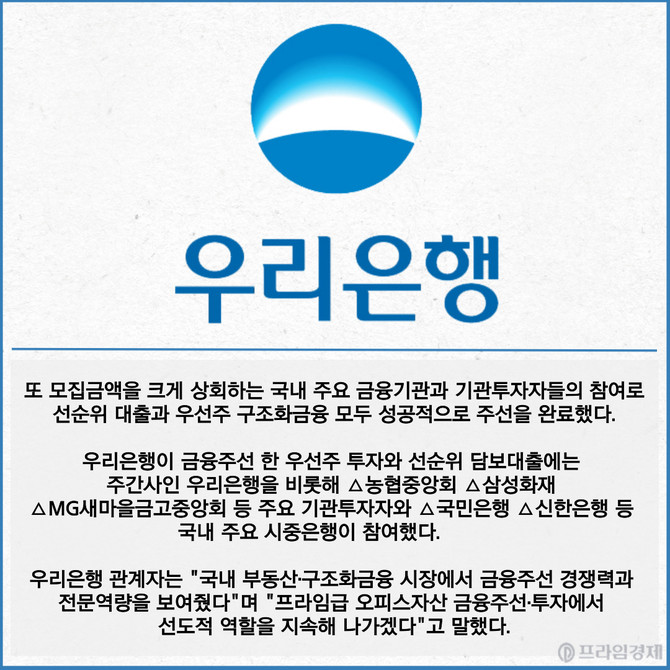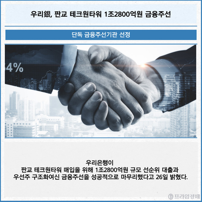 [프라임경제] 우리은행이 판교 테크원타워 매입을 위해 1조2800억원 규모 선순위 대출과 우선주 구조화여신 금융주선을 성공적으로 마무리했다고 26일 밝혔다.
