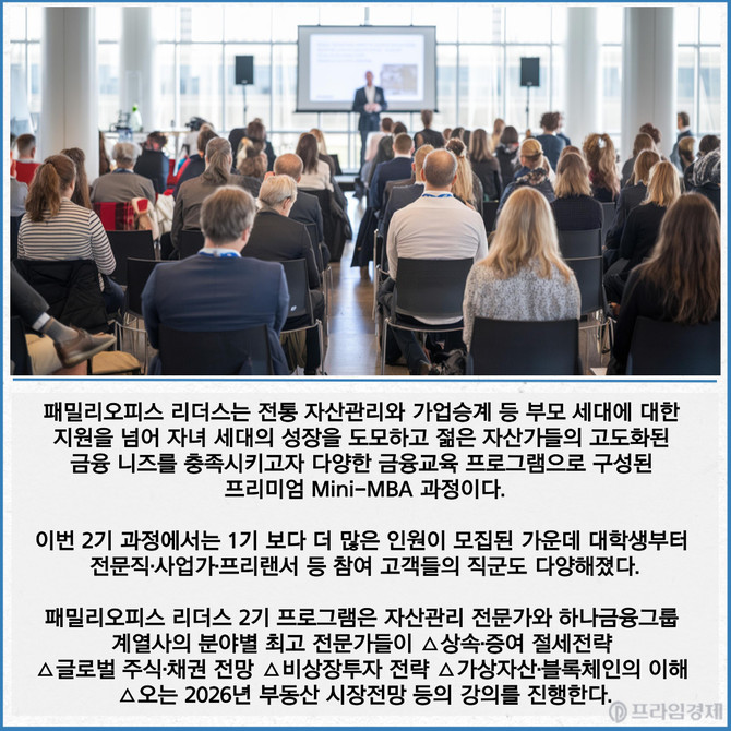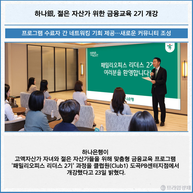 [프라임경제] 하나은행이 고액자산가 자녀와 젊은 자산가들을 위해 맞춤형 금융교육 프로그램 '패밀리오피스 리더스 2기' 과정을 클럽원(Club1) 도곡PB센터지점에서 개강했다고 23일 밝혔다.