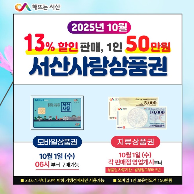 ■ 추석 맞아 '서산사랑상품권' 150억원 확대 발행...13% 할인 판매로 지역경제 활력 기대