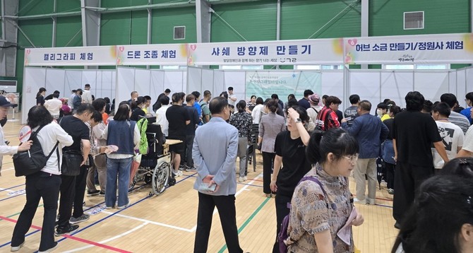 충남 논산시 사람꽃복지관(관장 김남흥)은 지난 25일 논산 전천후실내체육관에서 '소중한사람들 진로·직업 체험 박람회'를 개최했다. 이번 박람회에는 소중한사람들과 가족, 시설 종사자, 자원봉사자 등 200여 명이 참여했다.
