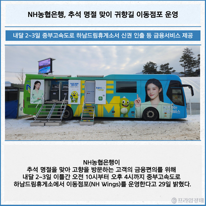 [프라임경제] NH농협은행이 추석 명절을 맞아 고향을 방문하는 고객의 금융편의를 위해 내달 2~3일 이틀간 오전 10시부터 오후 4시까지 중부고속도로 하남드림휴게소에서 이동점포(NH Wings)를 운영한다고 29일 밝혔다.
