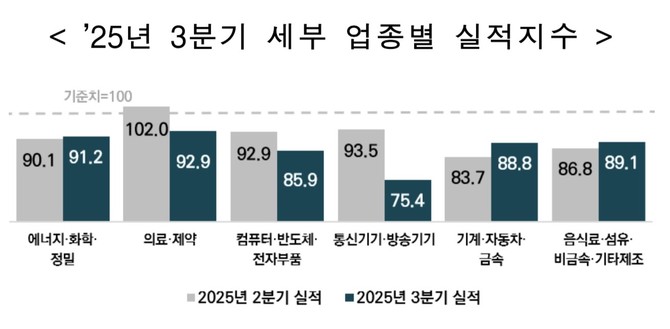 업종별로는 희비가 엇갈렸다. 제조업 실적지수는 88.2로 전 분기(88.9) 대비 소폭 하락해 모든 세부 업종이 기준치에 미달했다. 특히 의료·제약은 92.9에서 83.8로 급락하며 7분기 만에 기준치를 밑돌았다.