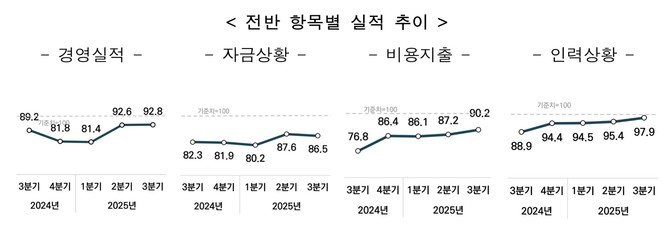 3분기 경기실적지수는 89.9로 전 분기(89.8) 대비 0.1포인트 오르며 두 분기 연속 상승했다. 1분기 최저점(78.6)에서 반등한 이후 안정적인 개선 흐름을 이어간 것이다.