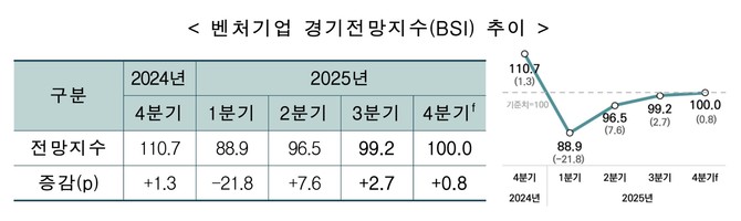 오는 4분기 전망은 더 긍정적이다. 벤처기업 경기전망지수는 100.0을 기록하며 지난해 4분기 이후 처음으로 기준치를 회복했다. 기업들은 △내수판매 호전(80.6%) △기술 경쟁력 강화(29.0%) △수출 호전(22.9%)을 주요 개선 요인으로 꼽았다. 반면 악화 전망 기업 중 81.5%는 내수판매 부진을 지목해 수요 위축 우려는 여전했다.