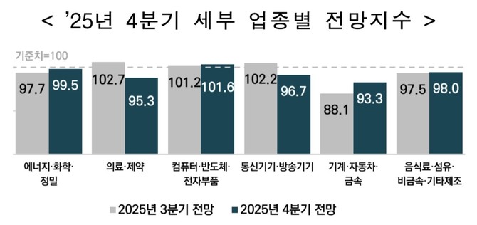 제조업 전망지수는 97.5로 전 분기 대비 1.1포인트 상승하며 3분기 연속 오름세를 보였으나 기준치에는 못 미쳤다. 세부 업종 가운데 컴퓨터·반도체·전자부품만이 101.6으로 100선을 웃돌았다.