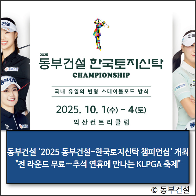 29일 동부건설에 따르면 올해 대회는 특히 1라운드부터 4라운드까지 전면 무료 개방을 실시해, 골프 팬뿐 아니라 익산 시민 누구나 부담 없이 국내 정상급 선수들의 플레이를 직접 관람할 수 있도록 했다. 추석 연휴 직전에 열리는 이번 대회는 스포츠를 통한 나눔과 지역사회와의 동행이라는 의미를 더하며, 명절 분위기를 한층 풍성하게 만들 전망이다.
