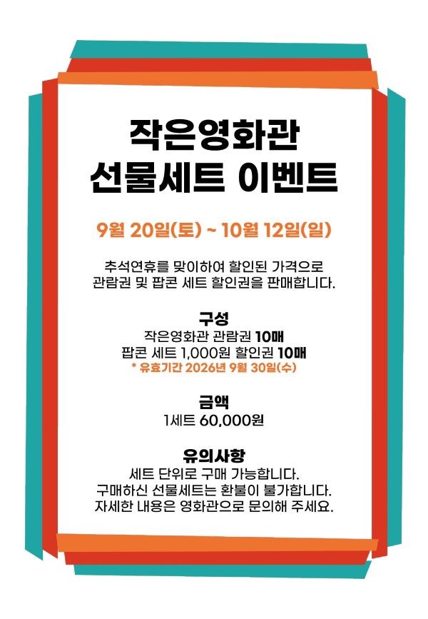 성주별고을시네마(창의문화센터 3층)는 민족 대명절 추석을 맞아 10월12일까지 '추석맞이 선물세트 이벤트'를 진행한다.