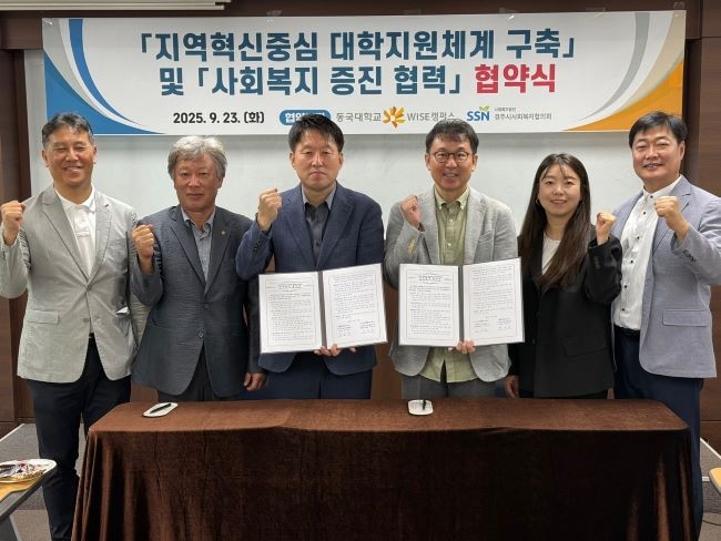 [프라임경제] 동국대학교 WISE캠퍼스 평생교육원(원장 이영찬)과 경주시사회복지협의회(회장 박경복)가 지난 23일 교내 평생교육원 회의실에서 지역혁신중심 대학지원체계 구축 및 사회복지 증진 협력 협약을 체결했다.