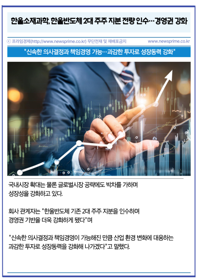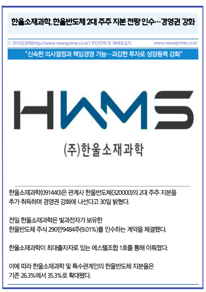[카드] 한울소재과학, 한울반도체 2대 주주 지분 전량 인수…경영권 강화