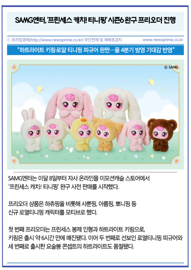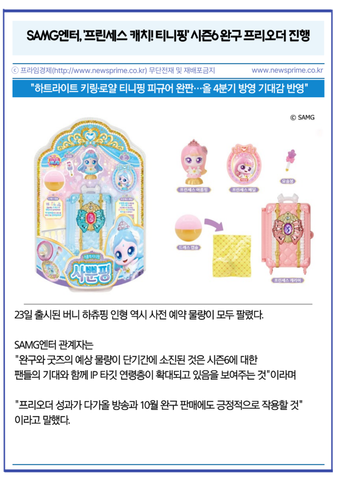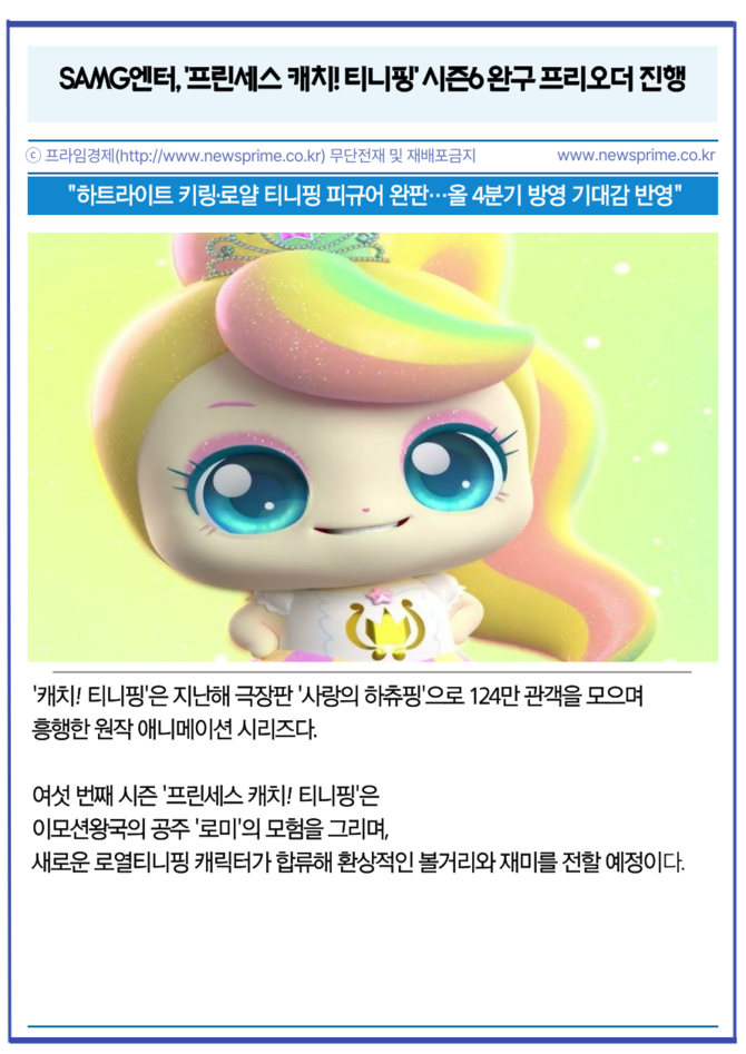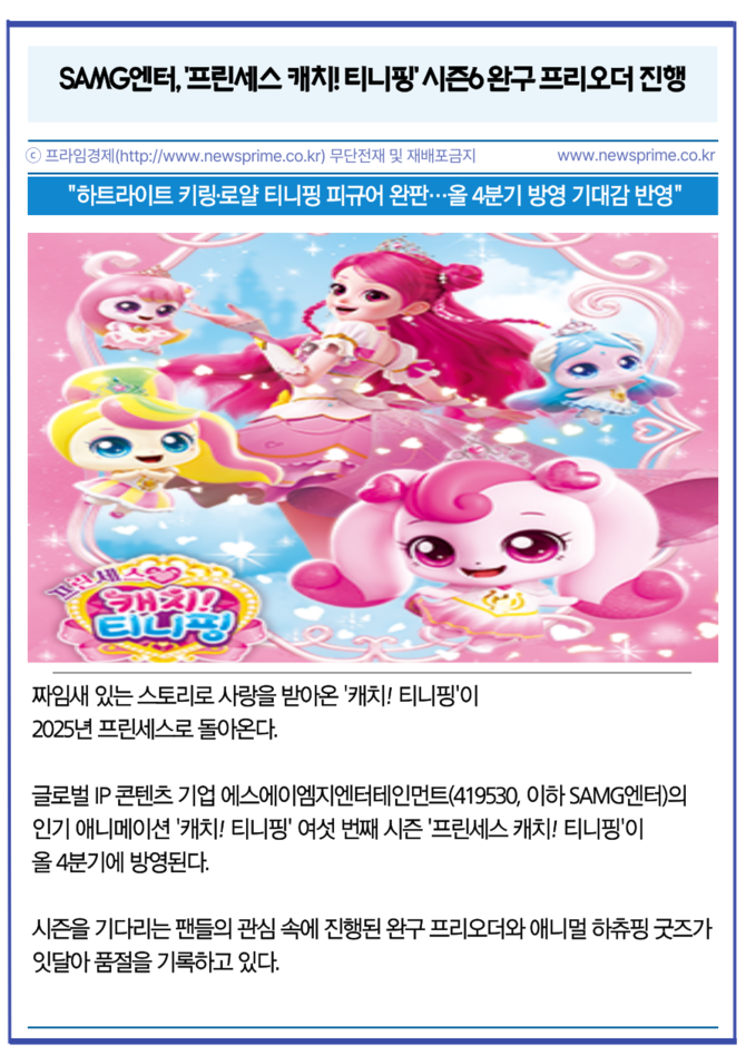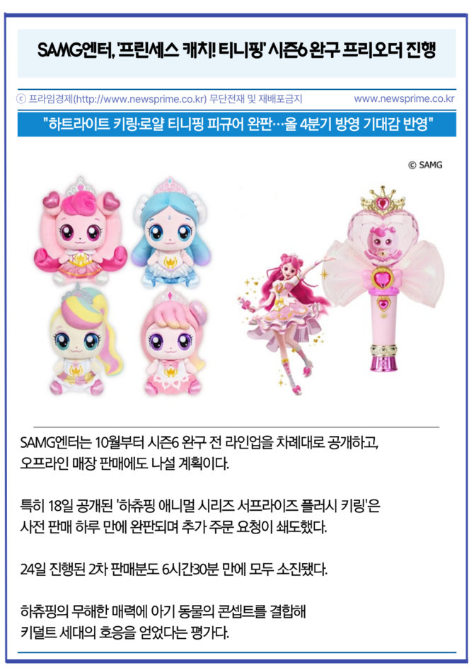 글로벌 IP 콘텐츠 기업 에스에이엠지엔터테인먼트(419530, 이하 SAMG엔터)의 인기 애니메이션 '캐치! 티니핑' 여섯 번째 시즌 '프린세스 캐치! 티니핑'이 올 4분기에 방영된다. 시즌을 기다리는 팬들의 관심 속에 진행된 완구 프리오더와 애니멀 하츄핑 굿즈가 잇달아 품절을 기록하고 있다.