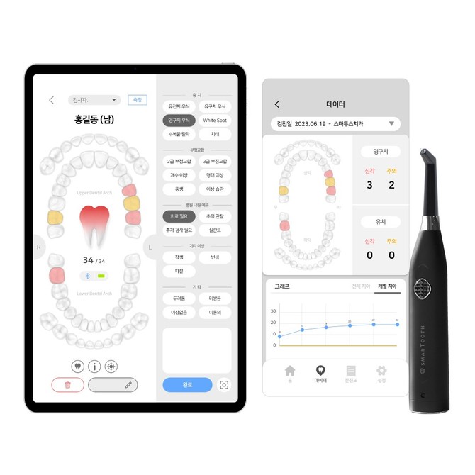 스마투스는 레이저 형광 기술 기반의 정량적 충치 진단기기다. 기존 시진이나 엑스레이 방식에서 한 단계 진화한 솔루션이다. 수치화된 데이터를 환자와 의료진에게 직접 제공함으로써 진단의 객관성과 설득력을 한층 강화한 것이 특징이다. 특히 환자별 데이터를 장기적으로 저장·관리할 수 있는 기능을 세계 최초로 구현했다. 이를 통해 예방 중심의 구강 건강 관리와 연구 활용도 면에서 높은 가치를 인정받고 있다.