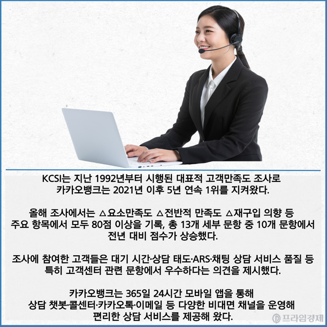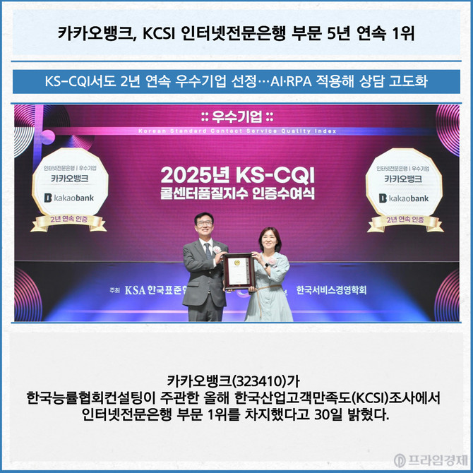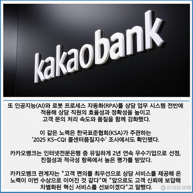 [프라임경제] 카카오뱅크(323410)가 한국능률협회컨설팅이 주관한 올해 한국산업고객만족도(KCSI)조사에서 인터넷전문은행 부문 1위를 차지했다고 30일 밝혔다.