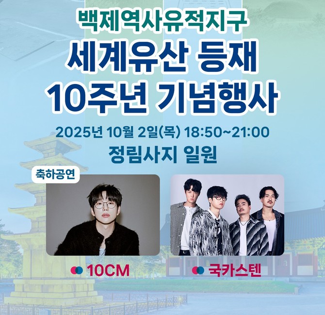 공식 행사에서는 세계유산 등재 10주년 축하 퍼포먼스와 정림사지 오층 석탑을 배경으로 한 미디어아트 공연이 펼쳐지고, 이어 인기가수 10CM와 국카스텐의 무대가 가을밤을 뜨겁게 수놓을 예정이다.